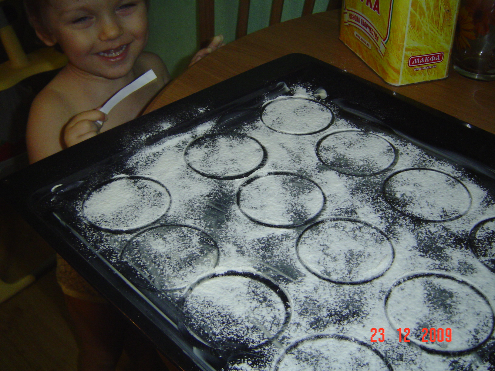 2. Подготавливаем противень: смазаваем маслом, присыпаем мукой и кружкой делаем крыжочки