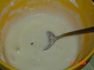 4. Добавляем муку, кукурузный крахмал, пудру, ванилин и растительное масло. Все перемешиваем