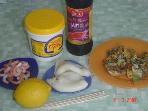 - По 200 г замороженных крупных креветок, кальмаров и мидий