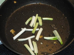 7. В сковороду добавить мясо, зеленую часть лука и соус. Перемешать и обжарить все в течении 2 минут