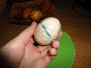 - далее отварите яйца обычным способом. Получатся интересные разводы. Можно вместо ниток использовать разноцветные шелковые лоскутки