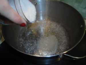 2. Вылить воду в глубокую кастрюлю и довести до кипения. Всыпать сахар и ягоду, перемешать. Варенье должно закипеть.